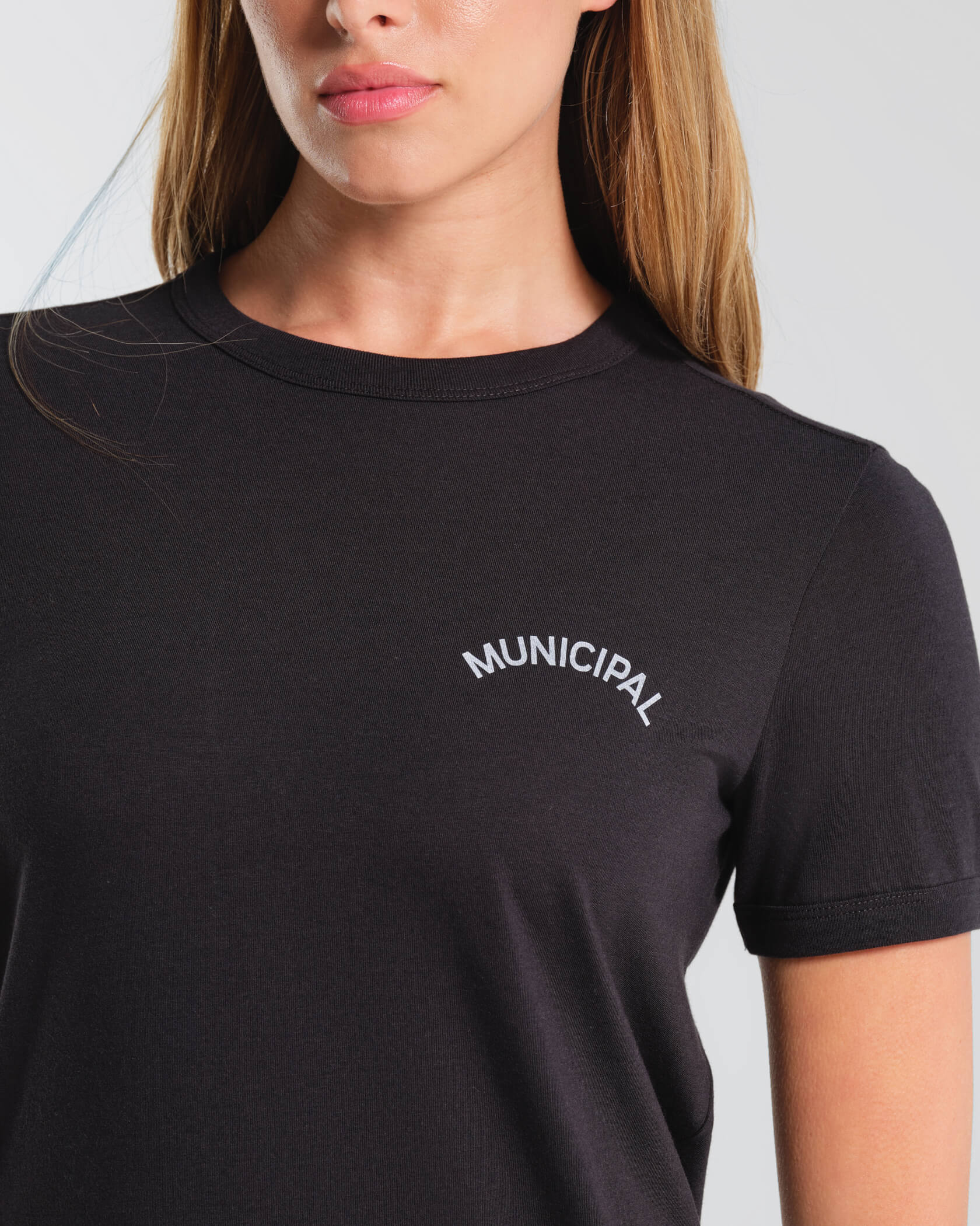 - Arched wordmark logo on the front left chest